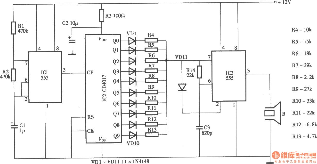 В схеме (полнорозмерная схема здесь) в качестве генератора используется стандартный таймер 555 на микросхеме IC1, работающий на частоте 40 кГц (раздражающая частота для собак и кошек).